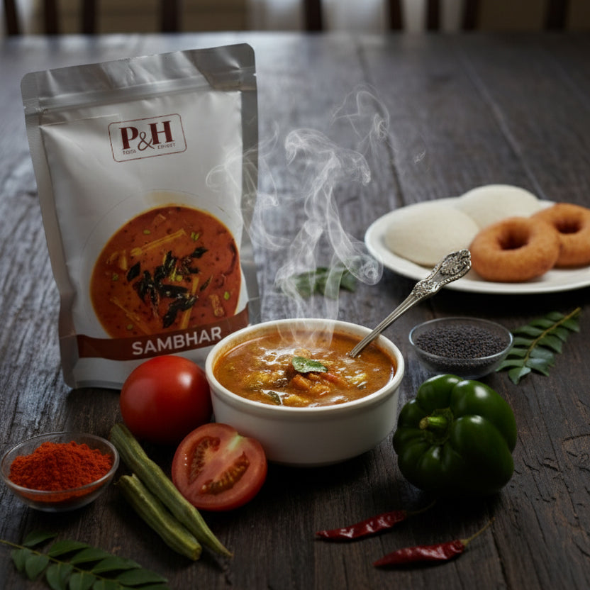 P&H Sambhar is a traditional South Indian preparation, carefully cooked to deliver a well-balanced taste, smooth consistency, and comforting aroma. Made using time-tested methods and prepared with modern retort processing, it offers a long shelf life without the use of artificial preservatives, while maintaining authentic flavor and quality.