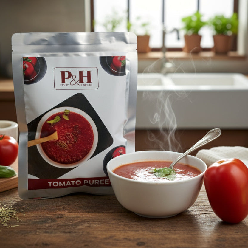 P&H Tomato Puree is made from fresh, fully ripened tomatoes, carefully selected to deliver authentic flavor, vibrant color, and natural nutrients. Prepared using modern techniques and retort processing, it ensures long shelf life without the use of artificial preservatives.